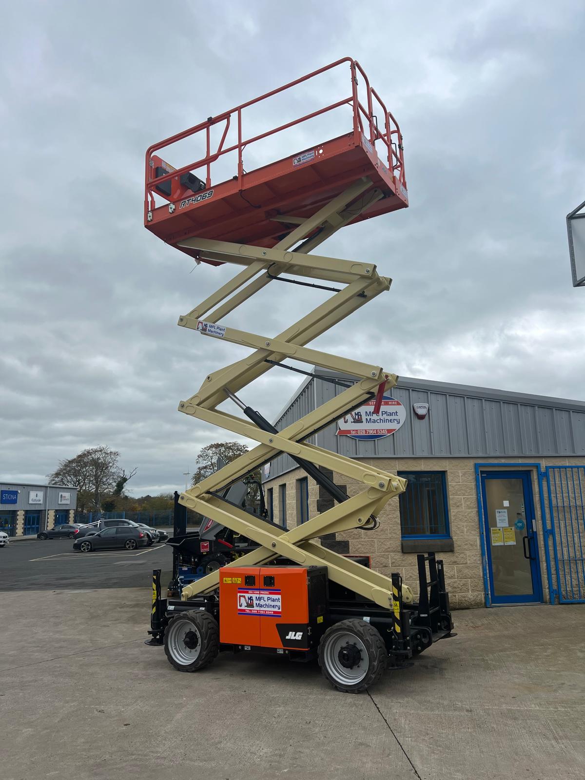 JLG 4069RT Rough terrain scissor lift hire for outdoor access and construction environments.