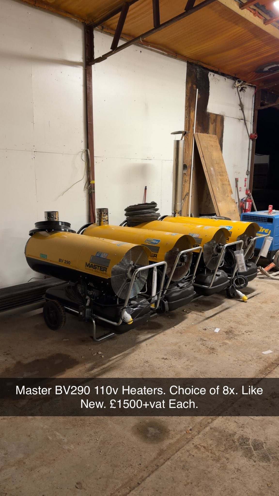 Used Master BV290 110v indirect diesel heaters for sale, ideal for construction sites, workshops, warehouses and event spaces across Northern Ireland, Belfast, Derry, Mid Ulster and throughout the UK. These second-hand / ex-hire industrial heaters provide powerful, reliable heat with safe indirect airflow for enclosed areas.